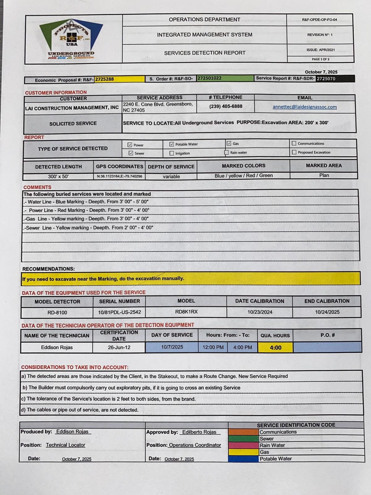 PROJECTS R&F USA, begins utility locating services operations in November 2016. By the end of 2025, we have consists of a Portfolio of over 194 Construction – Commercial Clients, we have performed 545 Private Utility Locating Services in the states: VA, NC, SC, GA, TN, FL, TX No third party damages and no lost time accidents.